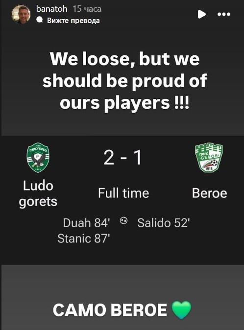 Собственикът на Берое Ернан Банато изрази задоволство от представянето на тима в мача с Лудогорец. Възпитаниците на Хосу Урибе загубиха с 1:2 като гости, след като до заключителните минути водиха с 1:0, но допуснаха обрат.
