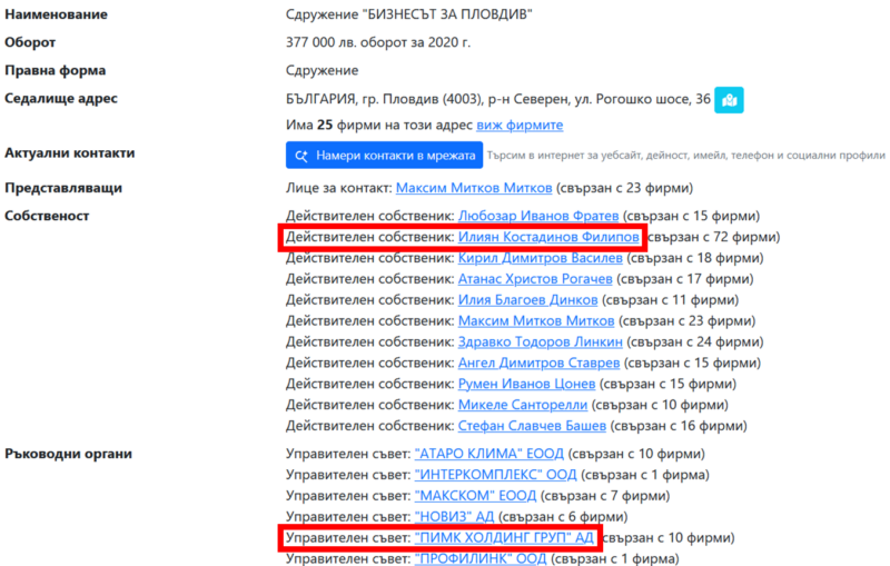 Филипов е част от действителните собственици на Сдружението, докато неговата компания „ПИМК Холдинг Груп АД“ е част от управителния съвет на „Бизнесът за Пловдив“.