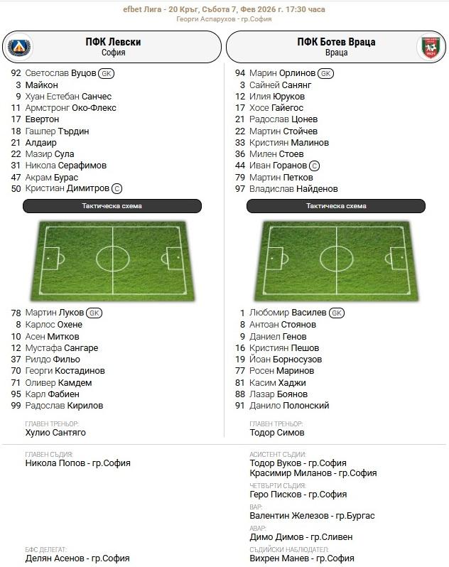 СЪСТАВИ: Левски – Ботев (Вр), Хуан Переа и Око-Флекс са титуляри