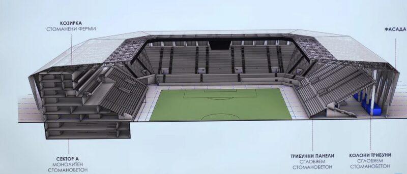 Конструктивното решение включва монолитно изпълнение на сектор „А“, сглобяеми елементи за секторите „Б“, „В“ и „Г“, както и покривна конструкция със стоманени ферми. Предвидено е стадионът да бъде изцяло покрит с козирка, изпълнена с материали, които осигуряват оптимални условия за естествено ослънчаване на терена.