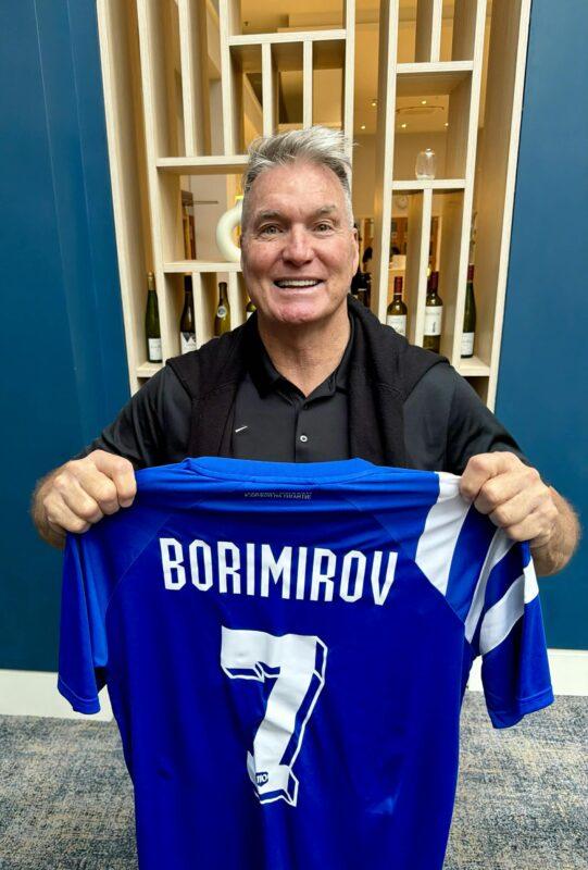 Холивудската звезда Сам Джоунс оказа голяма чест на изпълнителния директор на Левски Даниел Боримиров. 71-годишният актьор подписа фланелка на „сините“ с №7 и името на Боримиров на гърба пред погледа на българския финалист Кирил Евтимов.