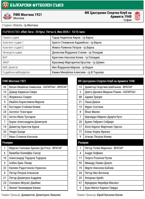 6 фев. 2026 | Станислав Тошев Време за четене: 0 мин СЪСТАВИ: Монтана – ЦСКА 1948! Голмайсторът на елита е резерва ЦСКА 1948 подновява шампионата с гостуване на Монтана. Двубоят на стадион „Огоста“ започва в 15:15 часа. Ето и съставите на двата отбора:
